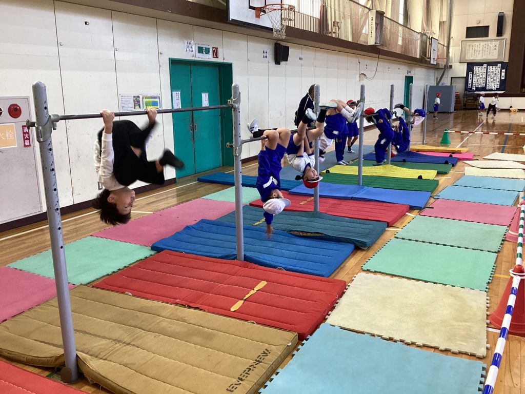 マラソン大会が終わり、いよいよ、体育館に鉄棒が設置されました。器械運動の時期となりました。早速、低学年の子供たちが、大休みに鉄棒のところに来ました。1年生は「先生、見てください!」「保育園の時にやったよ」「お家でも前回り練習してる。今は逆上がりの練習」と、話しかけてくれました。元気に体を動かして、いろいろな技に挑戦する姿に見入ってしまいました。