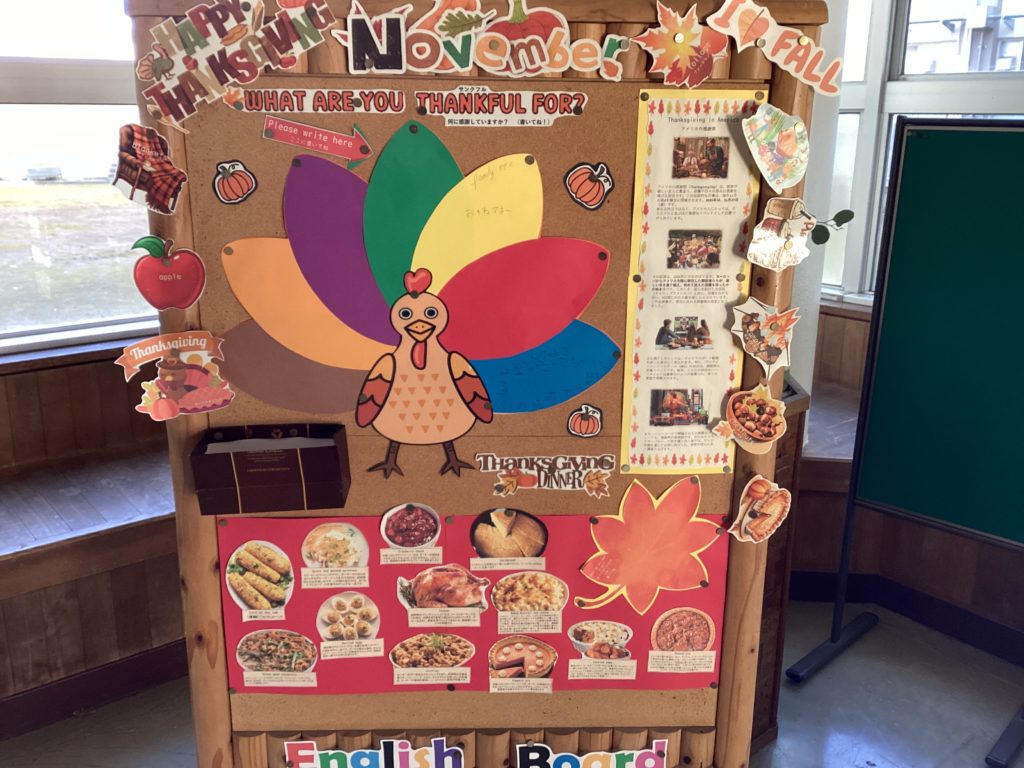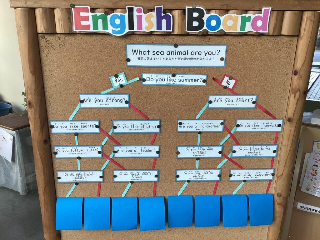 本校の外国語担当の教員が児童玄関のベンチのところに「English Board」を置いています。1年生から6年生まで、ふっと立ち止まって見ていく様子が見られます。自然と外国語に親しむことのできる環境です。1年生には、めくるボード(2枚目の写真)が人気で、何度もめくった跡が見られます。今朝は(1枚目の写真より)食べ物を見ている子が多かったです。