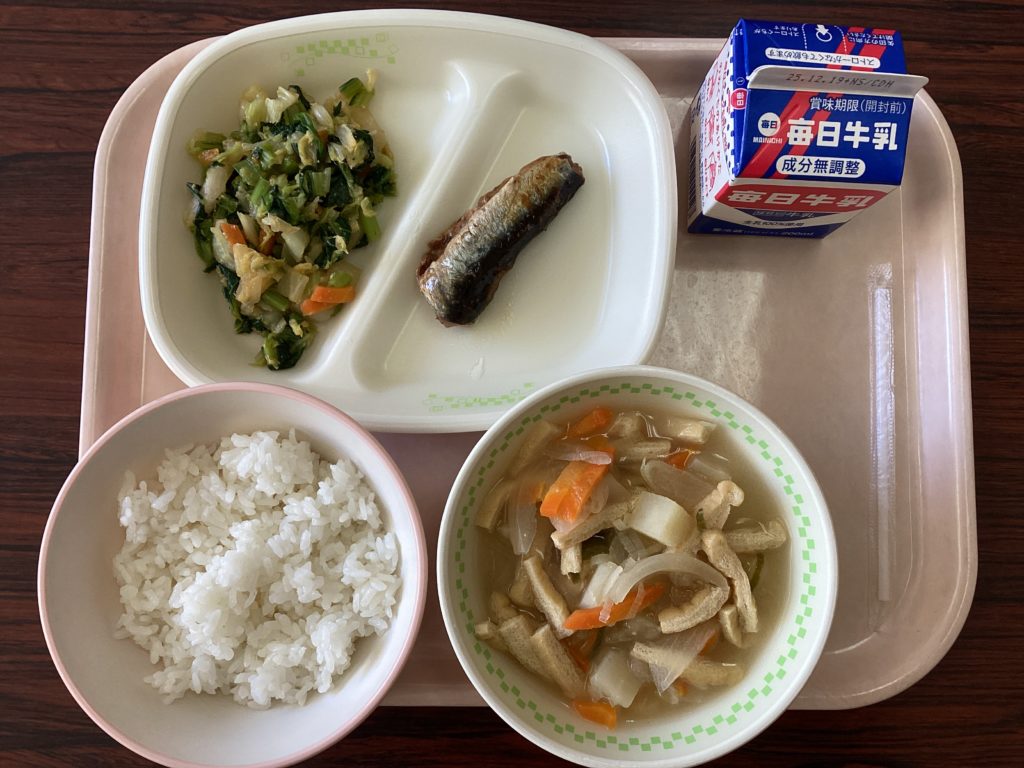 師走とはいえ、お天気も良く、休み時間に校庭で思いっきり遊ぶ子供たちの姿が見られました。給食が待ち遠しいようです。今日の給食は、鉄たっぷり給食。牛乳・ごはん・いわしのおかか煮・白菜のごま酢あえ・じゃがいもの味噌汁です。旬の野菜が使われていて、お魚の味付けも、とってもおいしかったです。ごちそうさまでした。
