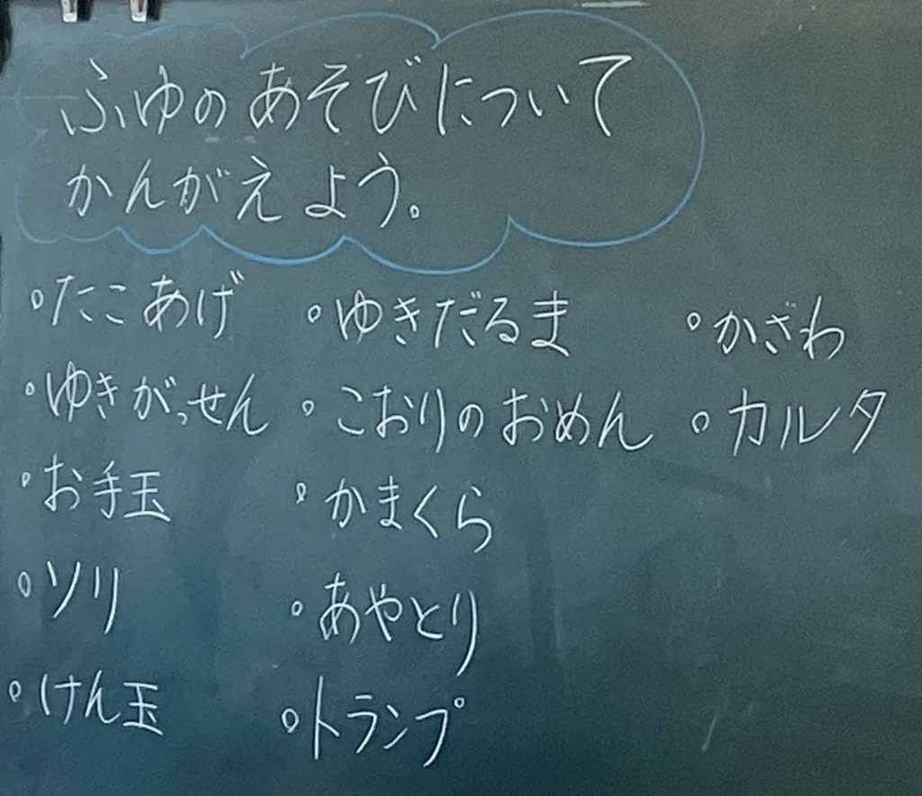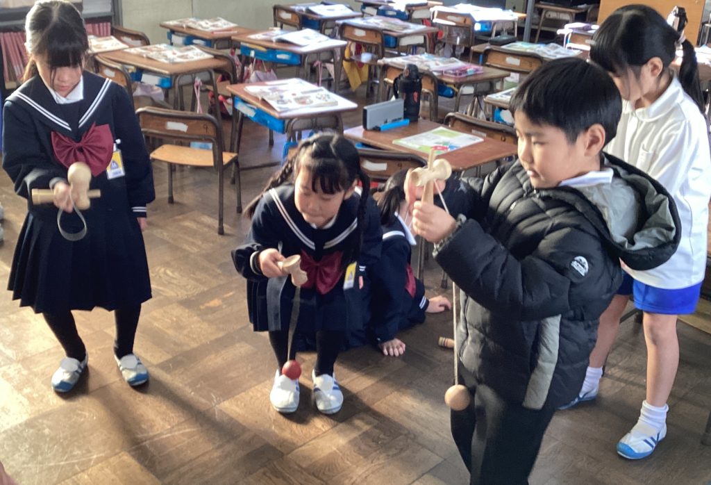 にぎやかな声が、校長室に聞こえてきました。廊下に出てみると、1年生の楽しそうな姿が目に飛び込んできました。「先生、できました~」「上にのりました~」満面の笑みです。生活科で「冬の遊び」をいろいろ思い浮かべ、そのうちの一つ「けん玉」に挑戦です。私もやってみましたが、なかなかのりません。子供たち、とっても上手です。