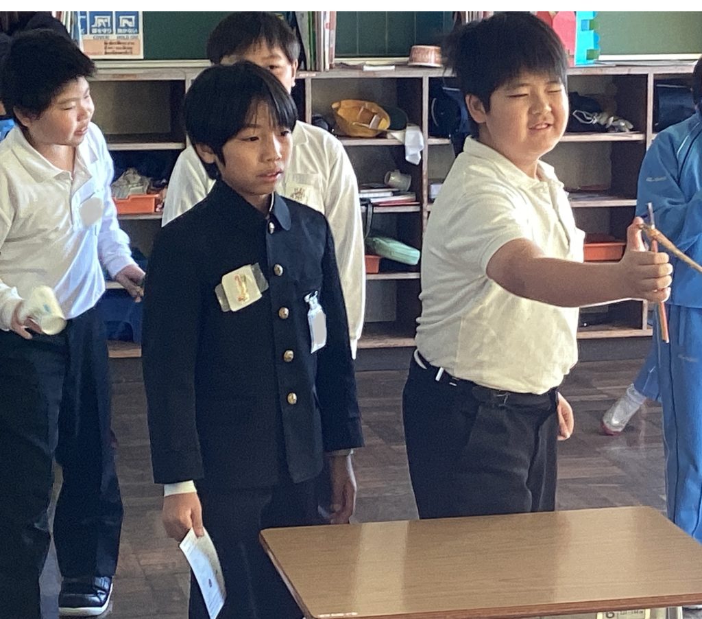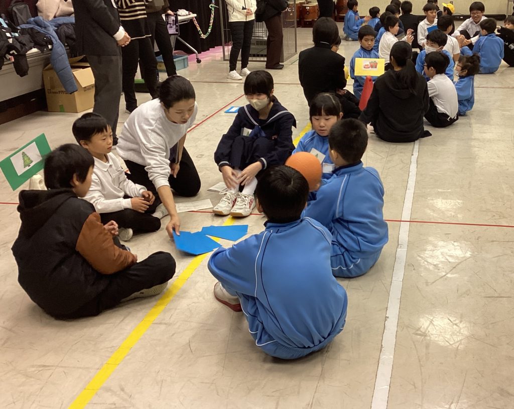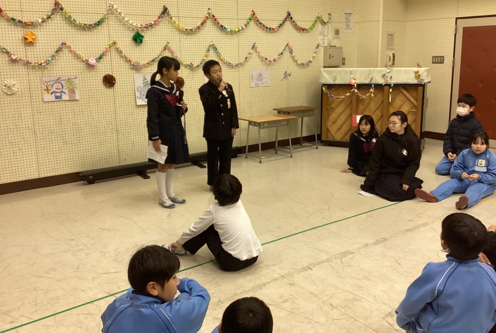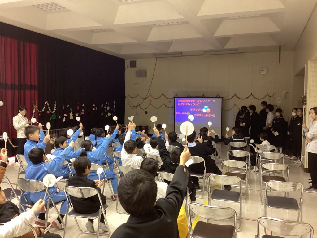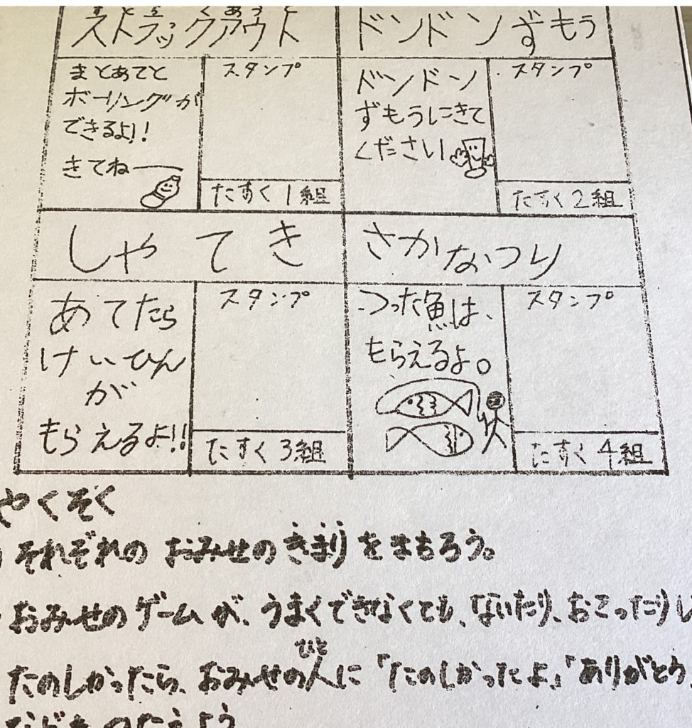 はじめは、清明小の子供たちの和太鼓の演奏です。一人一人が自分のパートをしっかりと覚え、とっても力強い演奏で響き渡っていました。足羽中のクイズでは、手作りの番号札を全員に渡してくれて、みんな楽しそうに参加していました。特に、正解した子供たちは盛り上がっていました。麻生津小の冬祭りでは、どんどんずもうや、射的など、楽しいものばかりで、どの教室も賑わいでいました。