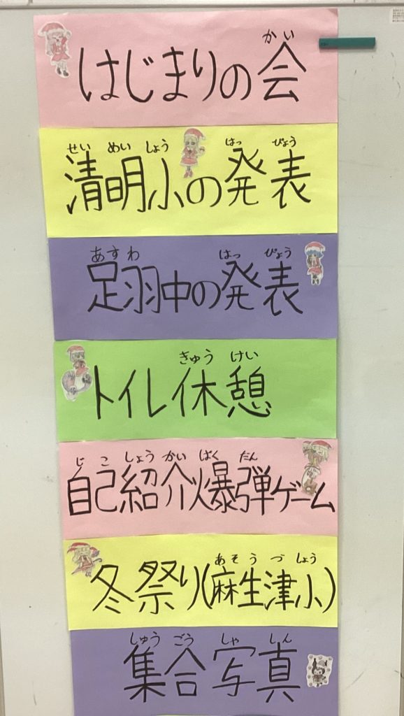 足羽中、清明小、麻生津小の特別支援学級の子供たちが交流しました。会場には、クリスマスツリーや飾り付けがたくさんあって、楽しみに待つ様子が伝わってきました。