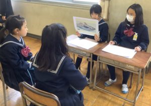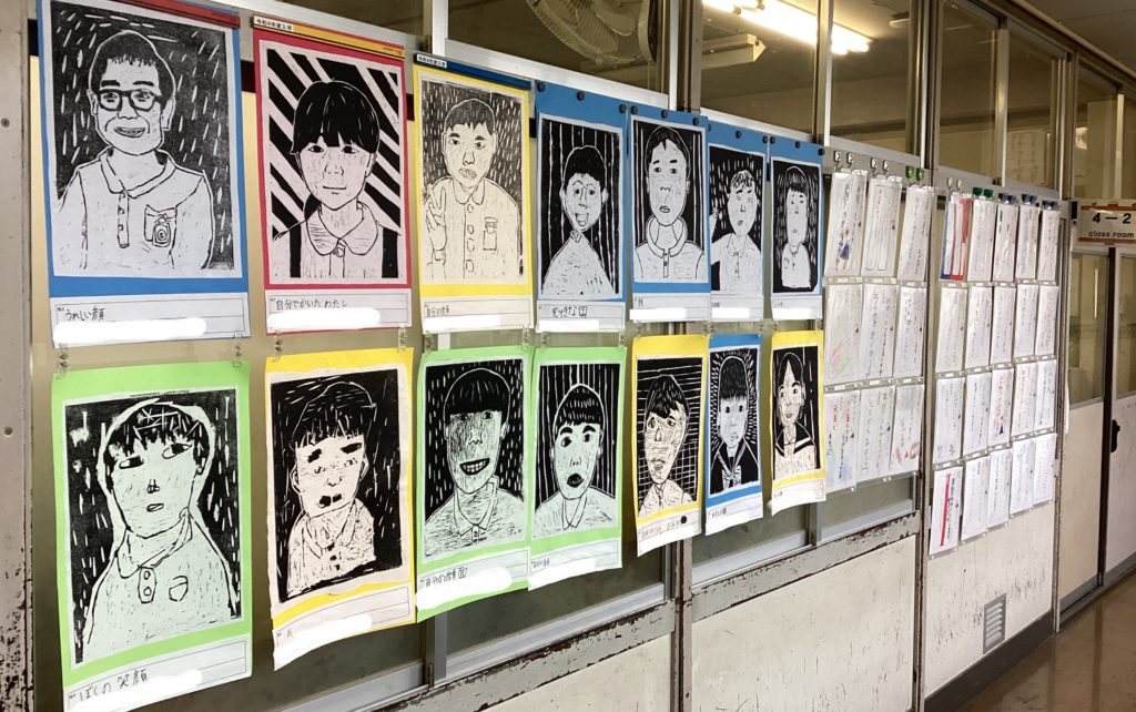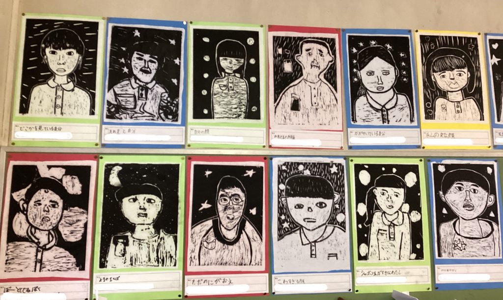 この時期になると、掲示物で多いのが、版画の作品。写真は4年生の木版画の作品で、自分自身のいろいろな姿を丁寧に彫刻刀で彫っています。白と黒のバランスもよく、顔の表情が細かく表現されています。黒い線の跡が残っているのも味があります。「かがやいている自分」「変な顔の自分」「しゃぼんだまがすきな私」など様々。背景の線彫りも工夫していて、台詞の色も、作品の鮮やかさを引き立てています。