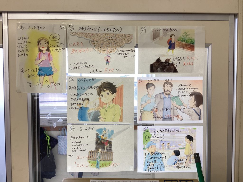 そのほか、教室には、道徳の学習で学んだことが掲示されていたり、5年生の廊下には、万博のことをまとめたものが掲示されていました。自主学習です。行ったことがない人にもわかりやすくまとめられていて、イタリアのことがよくわかりました。掲示物は学びの履歴。見応えがあります!
