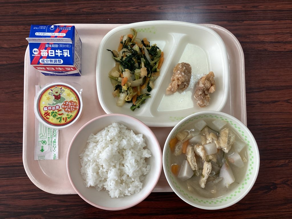 今日の献立は、牛乳・ごはん・鶏肉のから揚げ・青菜のごまあえ・福井のめぐみ汁・きなこプリンです。朝から、献立掲示板を見ながら「今日は、からあげが楽しみ」「早く食べたい」と言っている子がいました。から揚げは子供たちも大好きです。福井のめぐみ汁も、里芋やごぼう、にんじんやあげ等、具だくさんで、おなかいっぱいになりました。福井の地場産のお野菜、とってもおいしかったです。