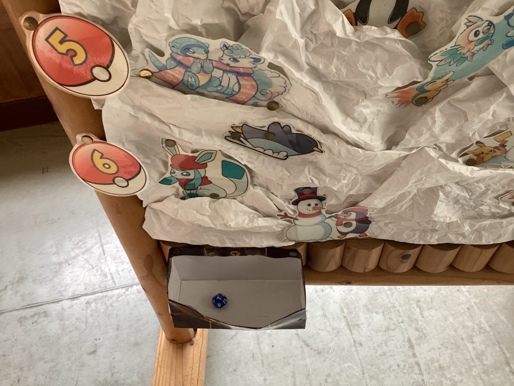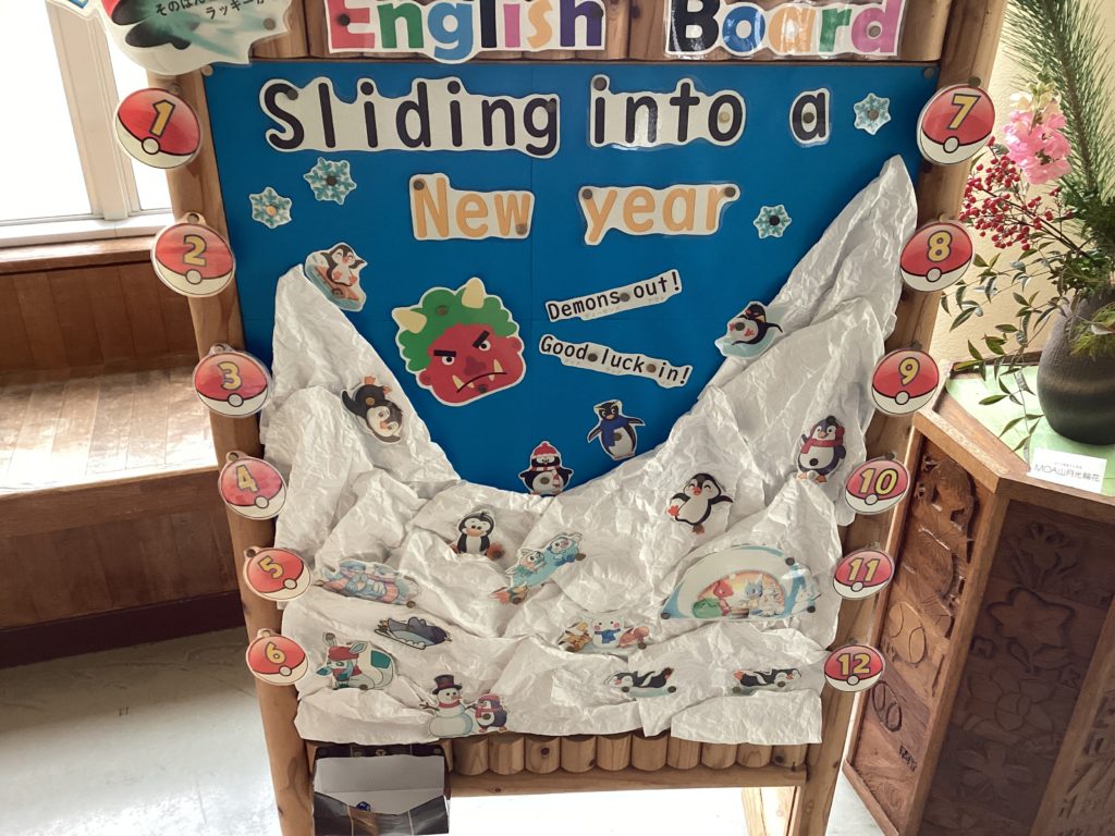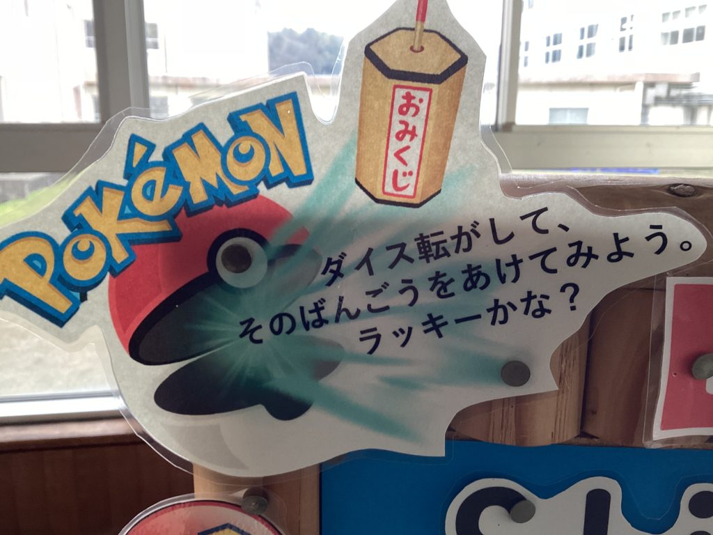 児童玄関のところに、今年初めてのEnglishボードが設置されました。「おみくじ」です。わくわくしながらダイス(サイコロ)を転がすことでしょう。これなら低学年も楽しめますね!自然に英語に親しむこともできます。