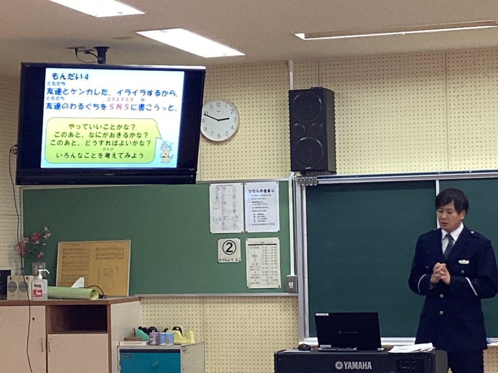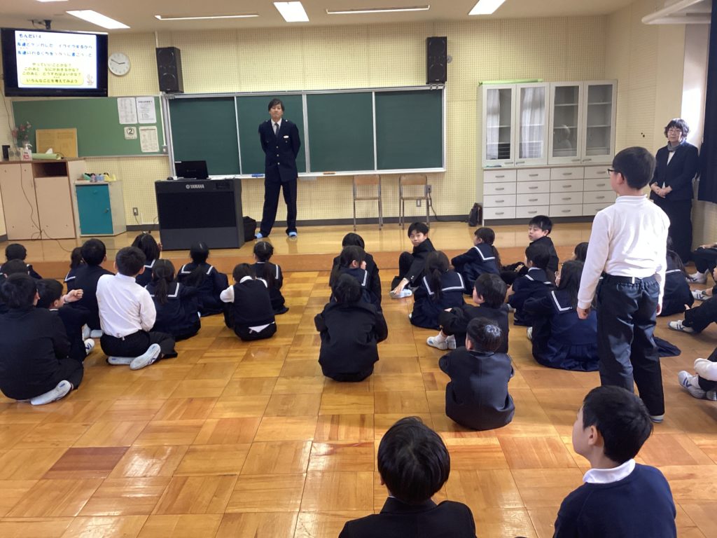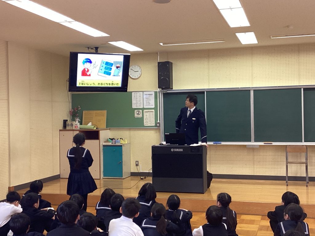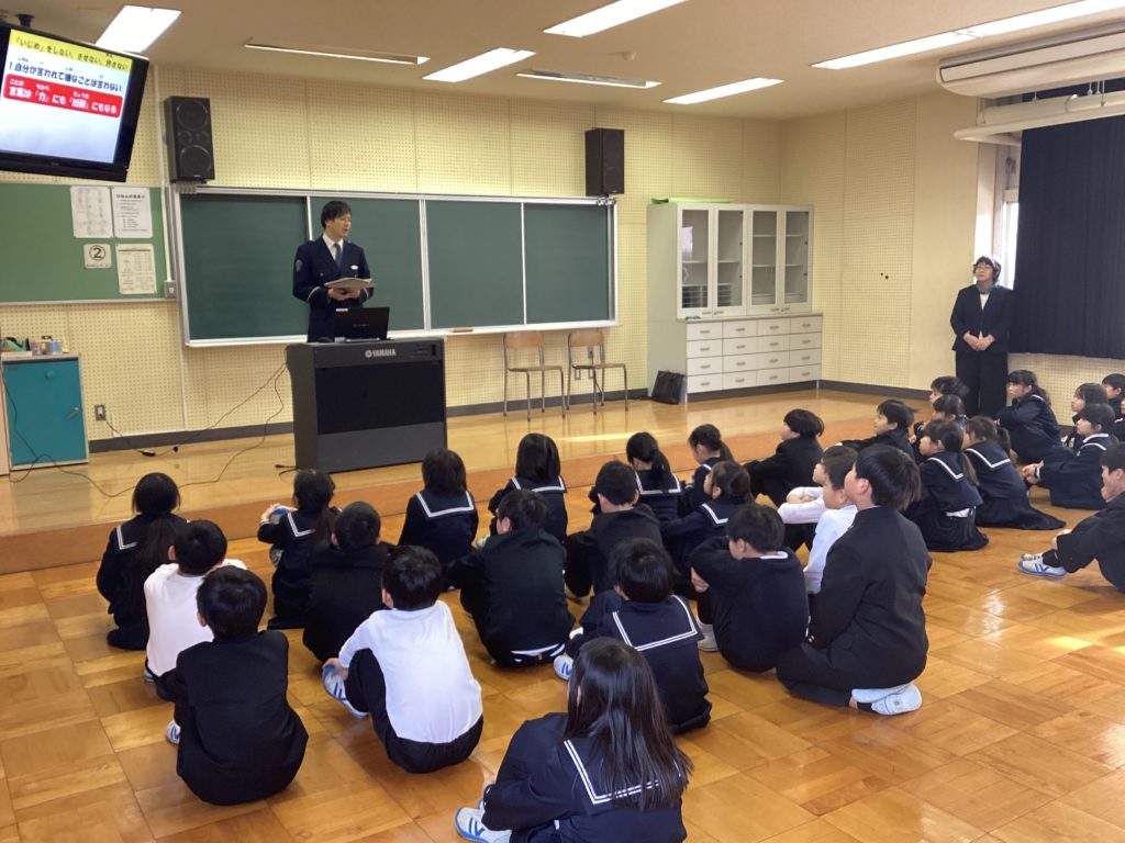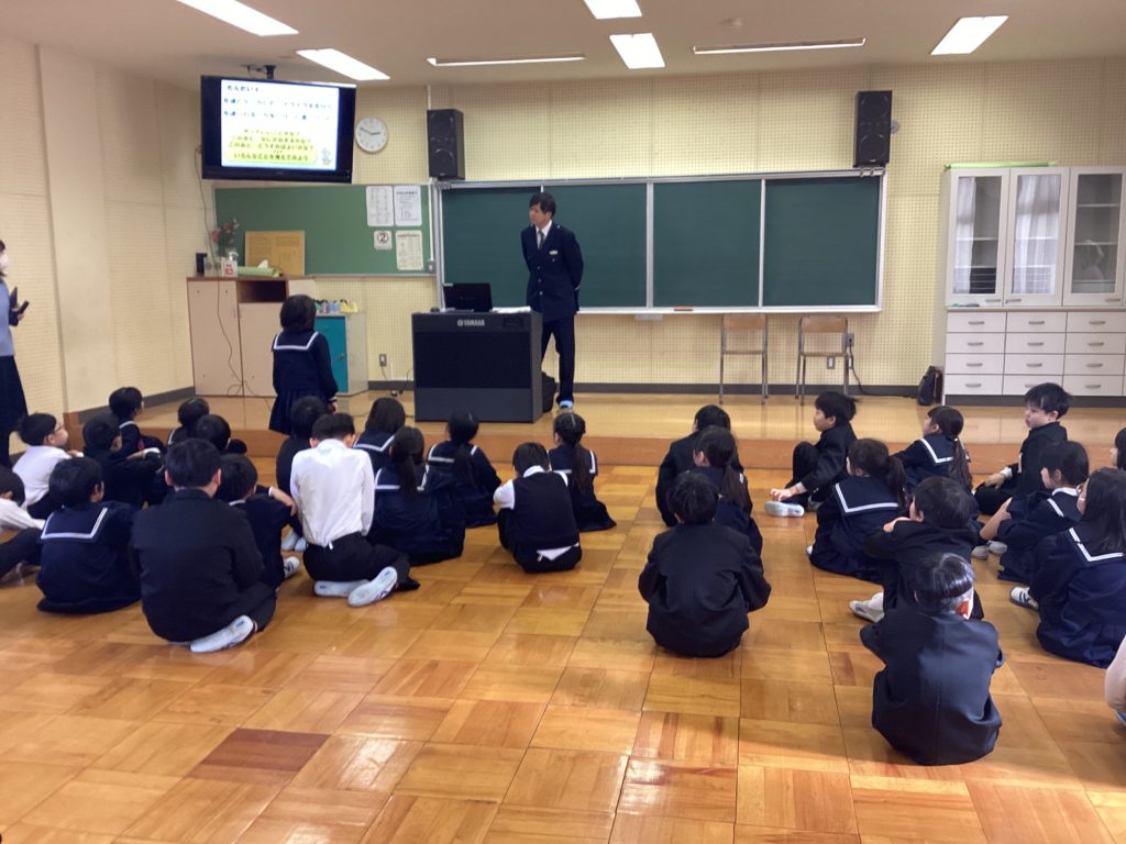 3年生を対象に「ひまわり教室」を行いました。警察署から来てくださった方が、子どもたちがいろいろな危険に巻き込まれないように、お話をしてくださいました。3年生の子どもたちは、全員、集中して真剣にお話を聴いていました。