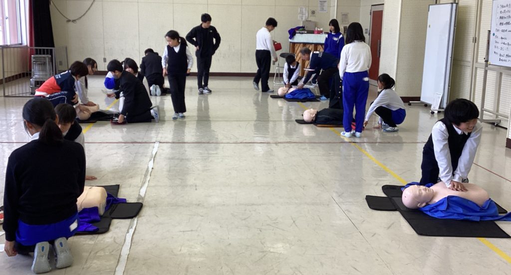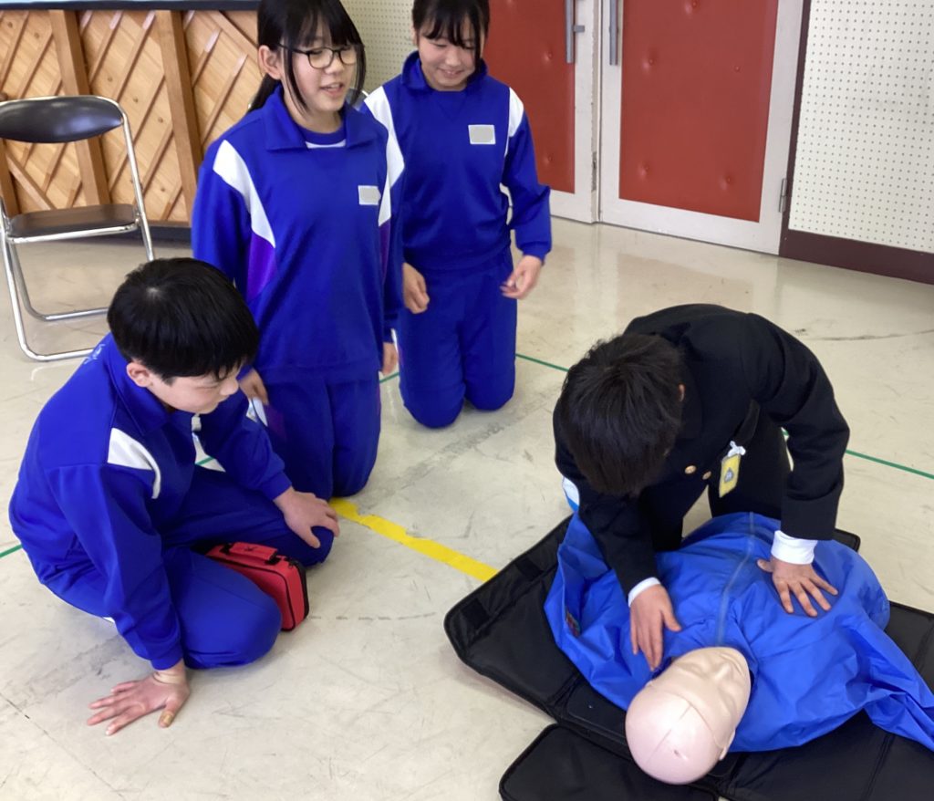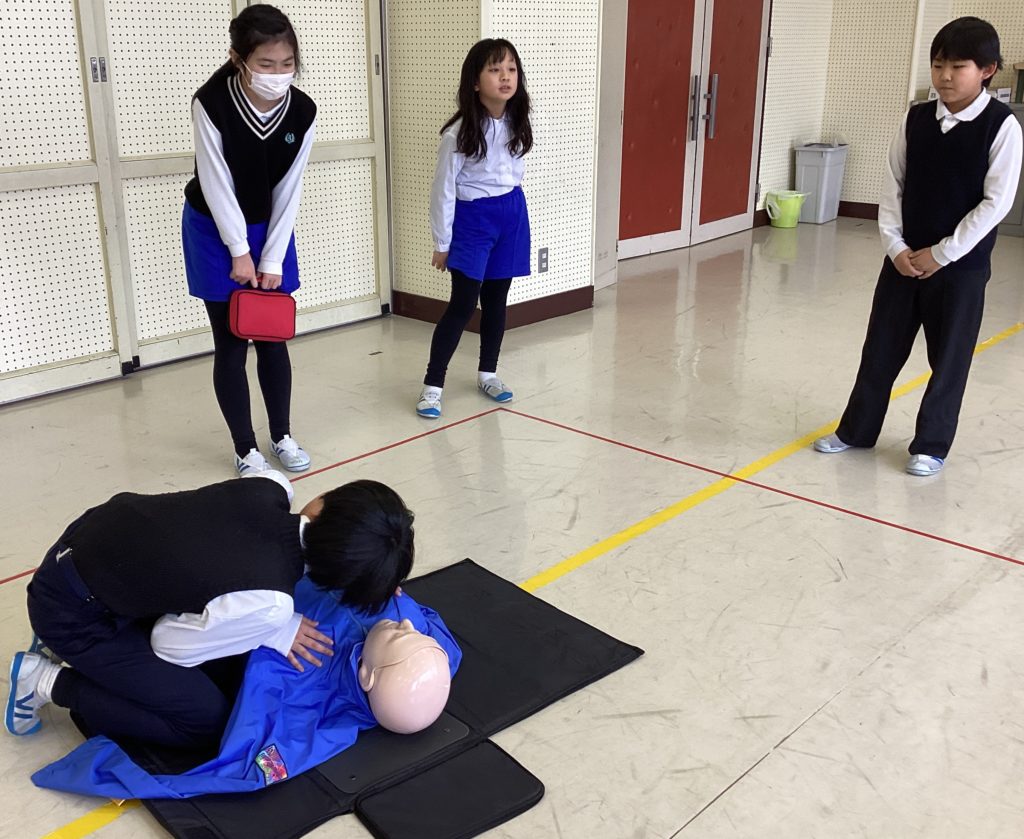 5年生は、しっかりとゲストティーチャーのお話を聞き、積極的に参加していました。実際に体験することで、「思ったより力がいる」「たくさん覚えることがある」と実感し、また、訓練の大切さにも気づいていました。この授業をきっかけに、いざという時に命を救う行動がとれる人間になってほしいと思います。