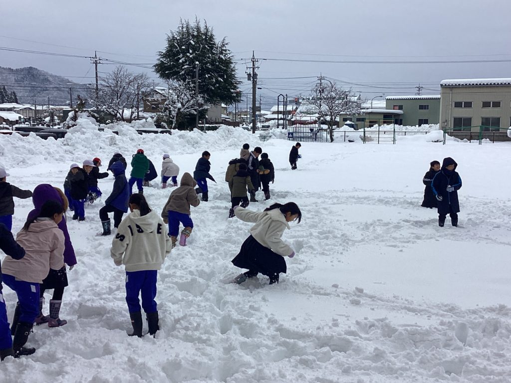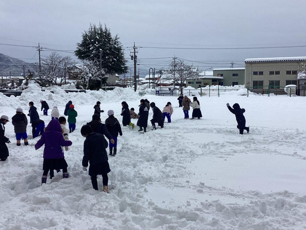 先週から、雪が降り続き、週末にはたくさん積もりました。校庭一面を雪が真っ白に染めています。休み時間になると、子どもたちは、歓声を上げながら、校庭に飛び出していきました。長靴で雪を踏みしめ、雪玉をつくって投げています。雪だるまを作っている子もいます。決して雪あそび日和ではありませんでしたが、思いっきり体を動かして、楽しそうに遊んでいました。