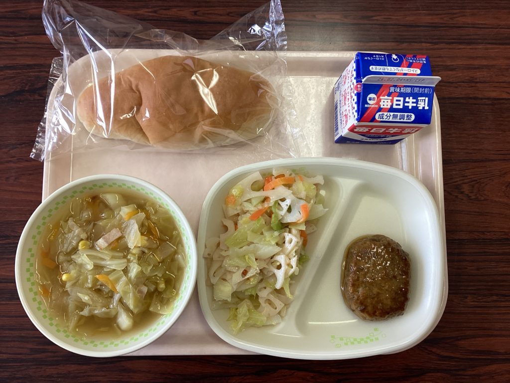 久しぶりにパンが出ました。メニューも、コッペパンに合うようなものばかり。特に、ハンバーグは、子どもたちに大人気です。コンソメスープやれんこんサラダとあわせて頂くのが楽しみですね。