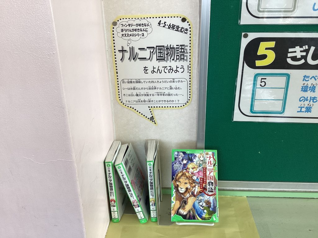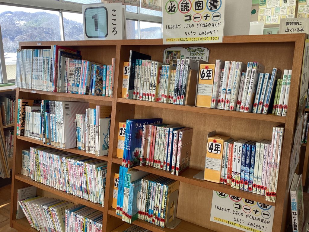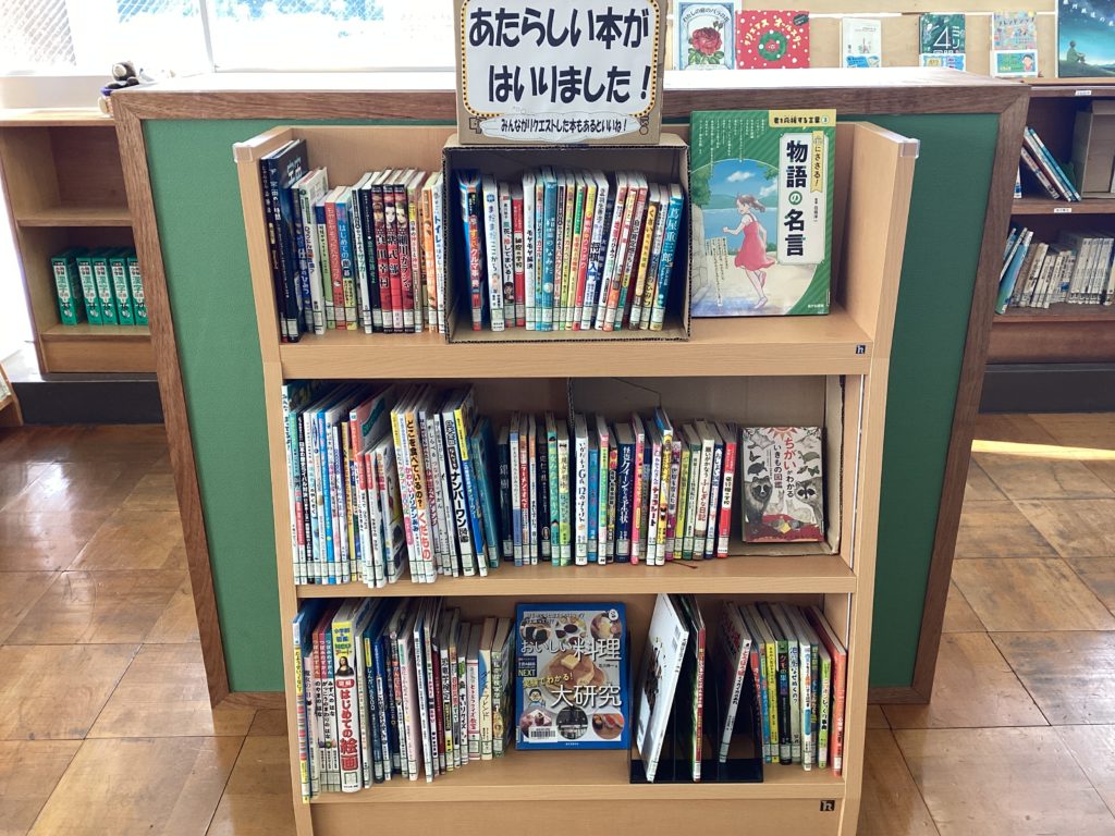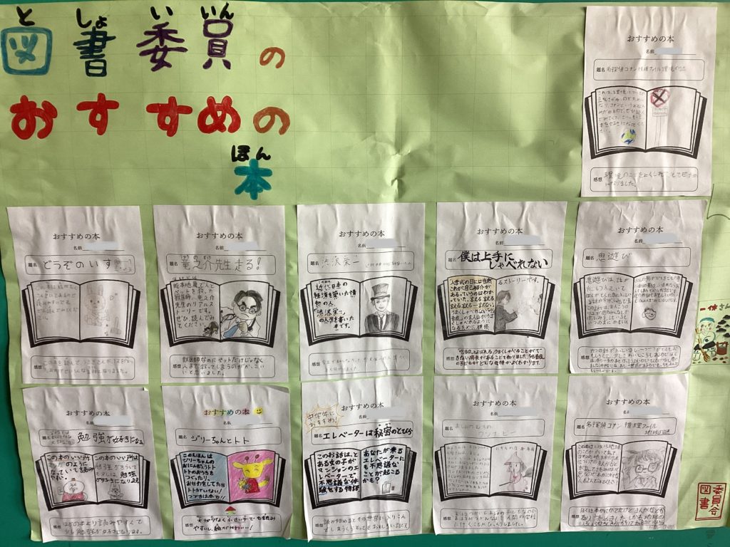 写真のように、図書委員会が「おすすめの本」を掲示してくれたり、給食の放送で、読み聞かせをしたりしてくれました。また、図書委員会の子どもたちは「寄贈していただく本を、全学年に希望をとって決めたい」という思いをもち、今、入ってきている本は、リクエストされた本がほとんどです。そのおかげで、次々と新しい本が借りられていきます。また、麻生津小学校の先生方も、国語の時間に、本に親しむことにつながる授業をしてくださっています。
