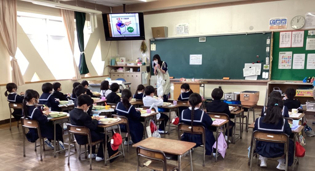 1年生にとって、小学校初めての給食です。献立は、牛乳・ご飯・豚肉のしょうが炒め・もやしとわかめの香りあえ・ごぼう汁です。当番さんは白衣を着て、自分の役割を行います。ご飯・お汁・おかず、それぞれ上手に分けています。給食をもらう子も、しっかり両手で持ち、こぼす子や落とす子は一人もいませんでした。席に着いてからも、静かに待つことができていて立派です。「おいしかった~」という声が聞こえてきました。よくがんばっています!